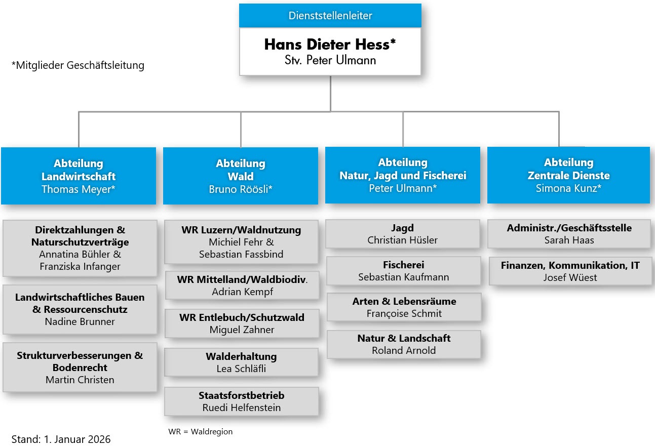 Die Abteilung Natur, Jagd & Fischerei (NJF) setzt sich für einen optimalen Ressourceneinsatz zur Erhaltung und Nutzung der reichen Tier- und Pflanzenwelt im Kanton Luzern ein. Zudem steht für alle Partner eine Verwaltungseinheit für die zentralen Belange von Flora, Fauna und deren Lebensräume als Ansprechpartnerin zur Verfügung.